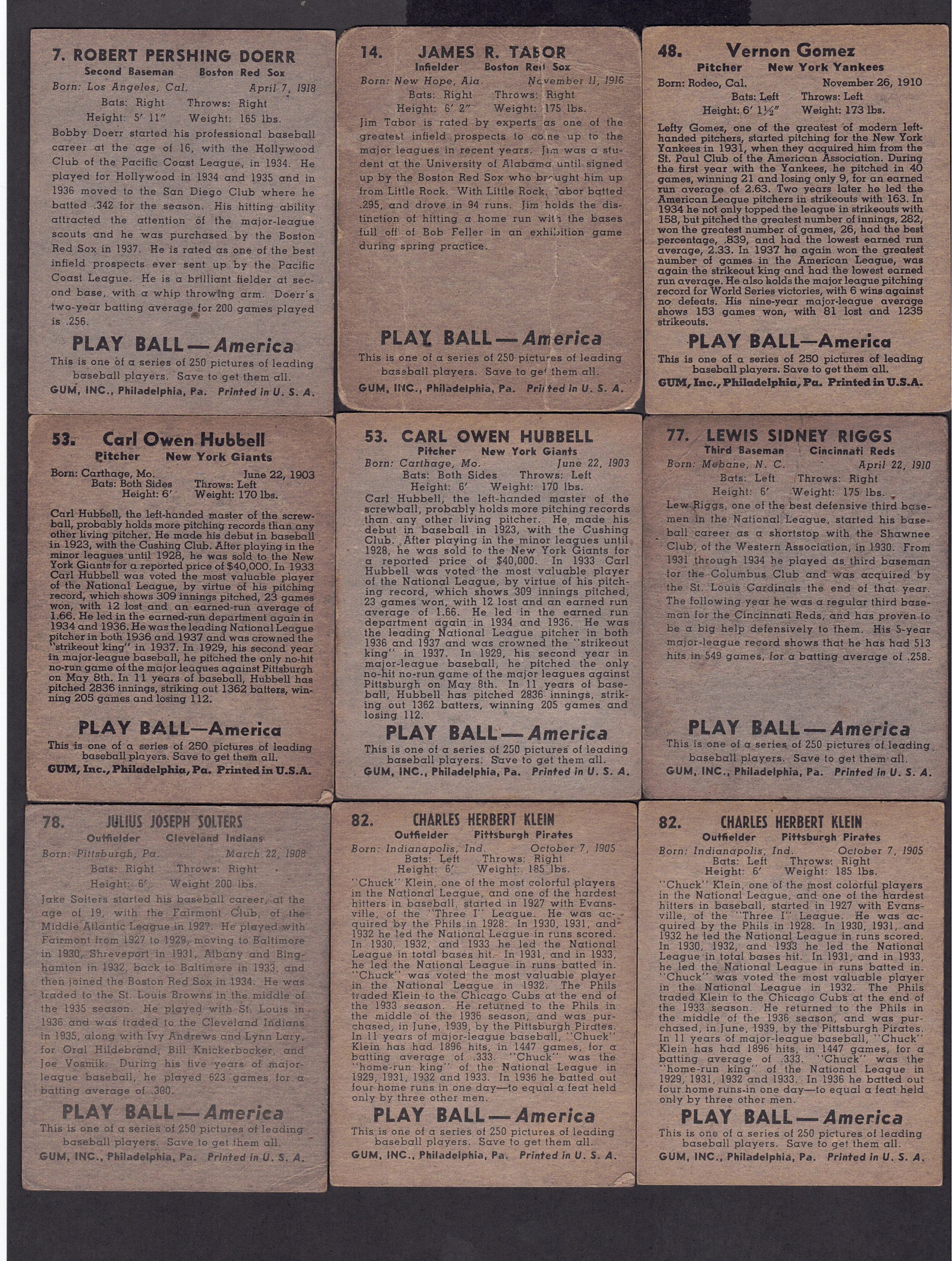 1939 Play Ball #7 Doerr #14 Tabor #48 Gomez #53 Hubbell #53 Hubbell #77 Riggs #78 Solters #82 Klein #82 Klein |