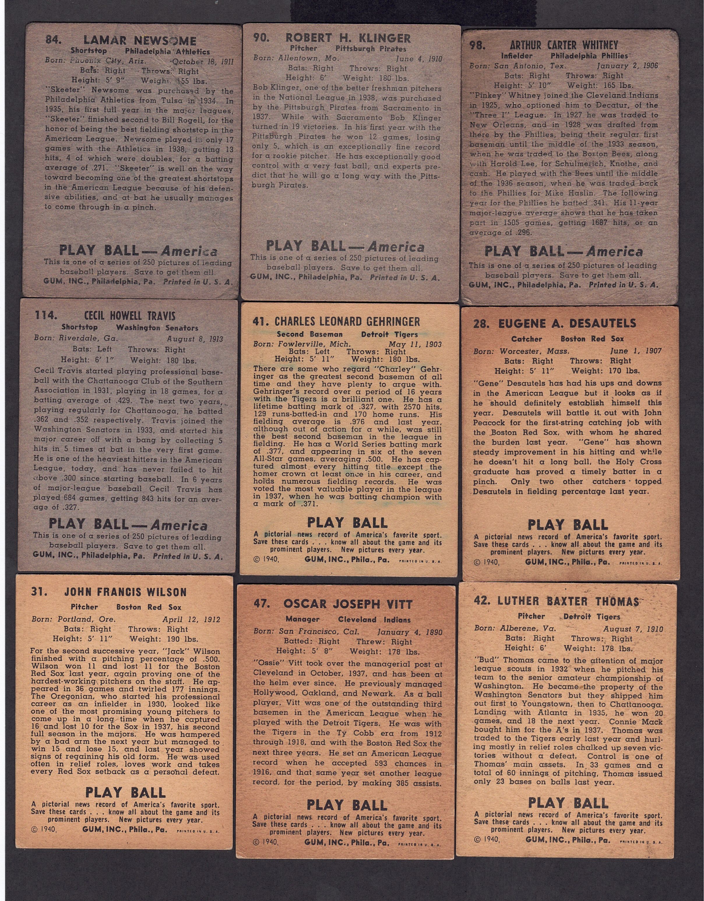 $125 $8 $90 $75 $125 $8 $8 $70 $old | #84 Newsome #90 Klinger #98 Whitney #114 Travis 1940 Playball #41 Gehringer #28 Desautels #31 Wilson #47 Vitt #42 Thomas |