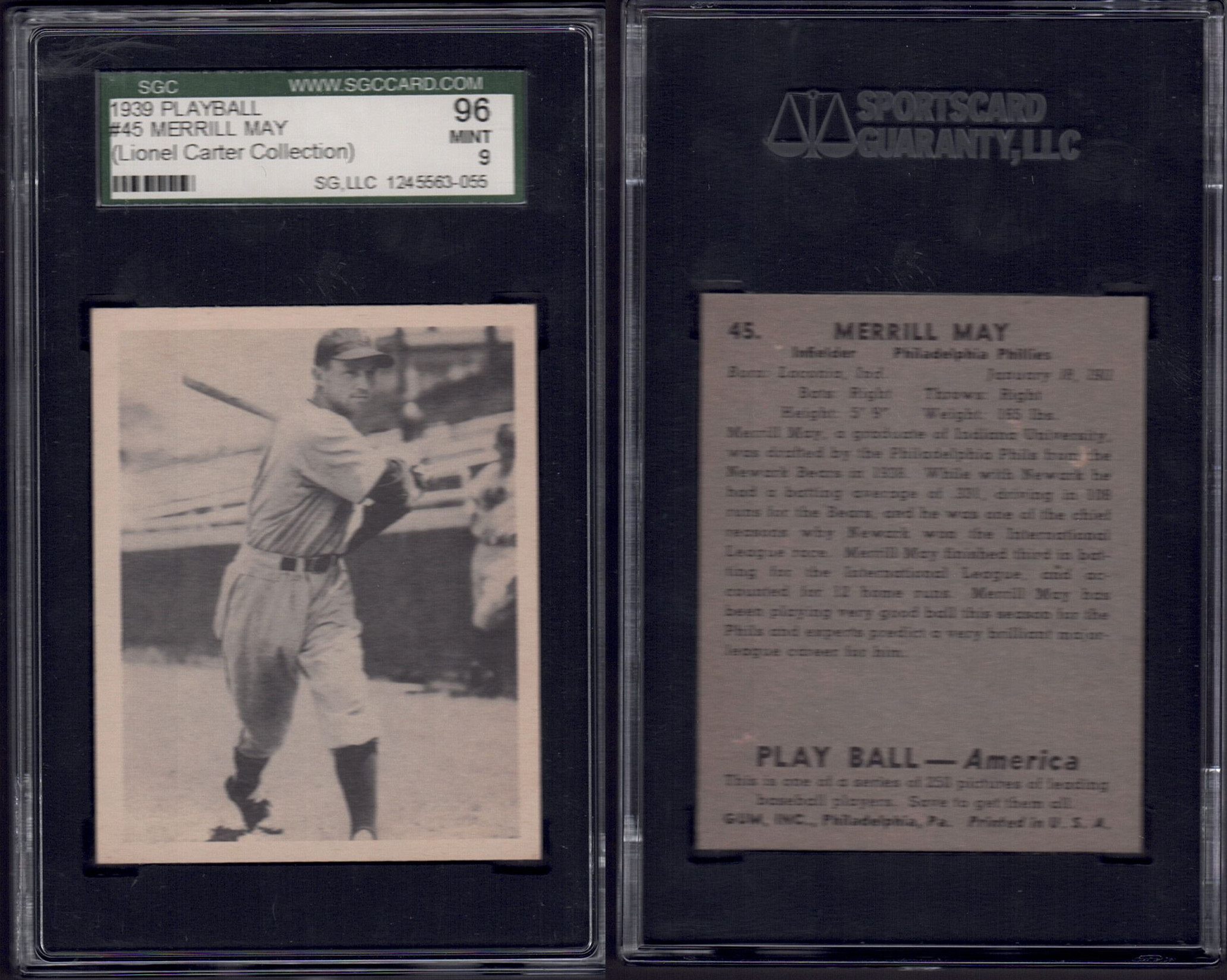 ![]() 1939 #45 Merrill May Lionel Carter provenance SGC 96 Price-$old |