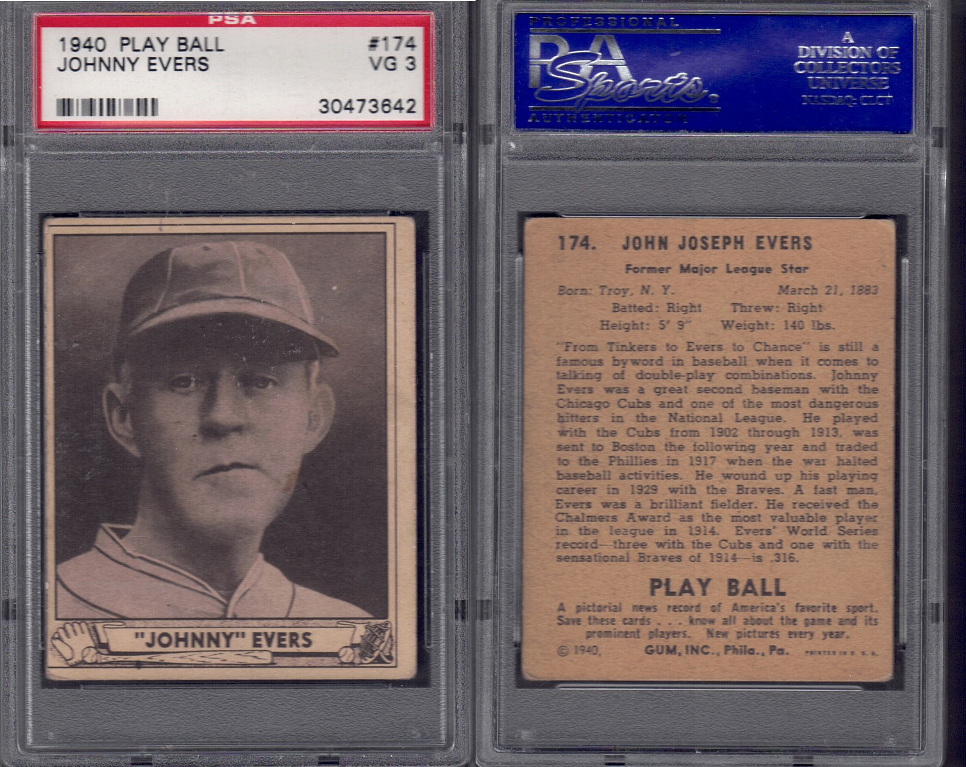 ![]() 1940 #174 Johnny Evers PSA 3 Price-$75.00 |